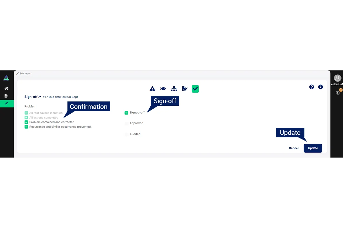 Once the Confirmation has been done, the Assignee can sign the RCA off.