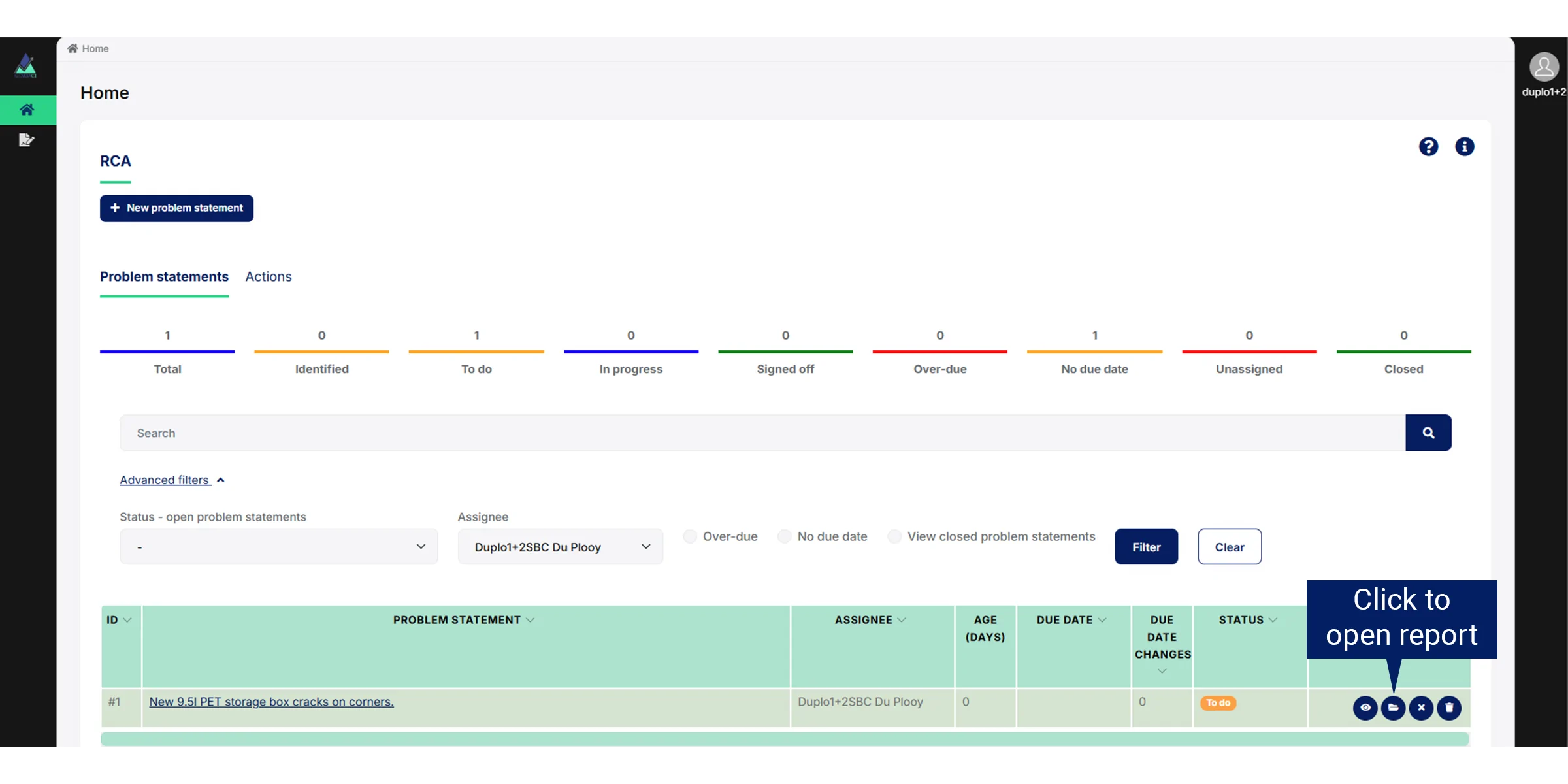 When you click on Open report for a specific problem statement the Open report page has a menu for the following pages: